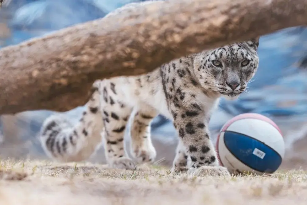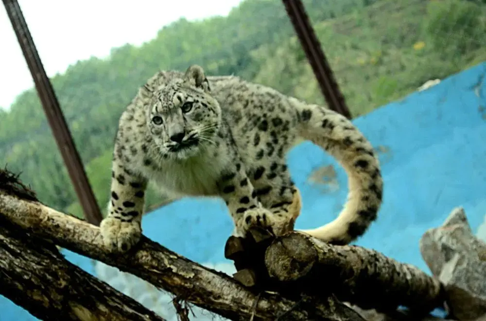 这是2017年拍摄的雪豹“傲雪”。一岁多的“傲雪”在西宁野生动物园雪豹馆的木头上玩耍。新华社发(西宁野生动物园供图)